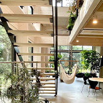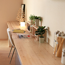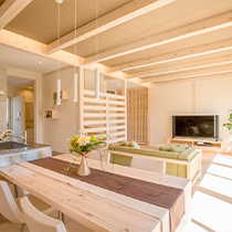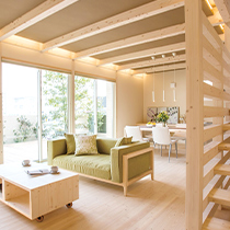 柱・梁・土台などの主要構造部すべてに「国産ひのき」を使用し、真のひのき造りの家をご提供しています。独自の高耐震・断熱パネル工法を採用し、耐震性能にもこだわりつつ、オリジナル開発の無垢建材など、無垢・自然素材を使用。